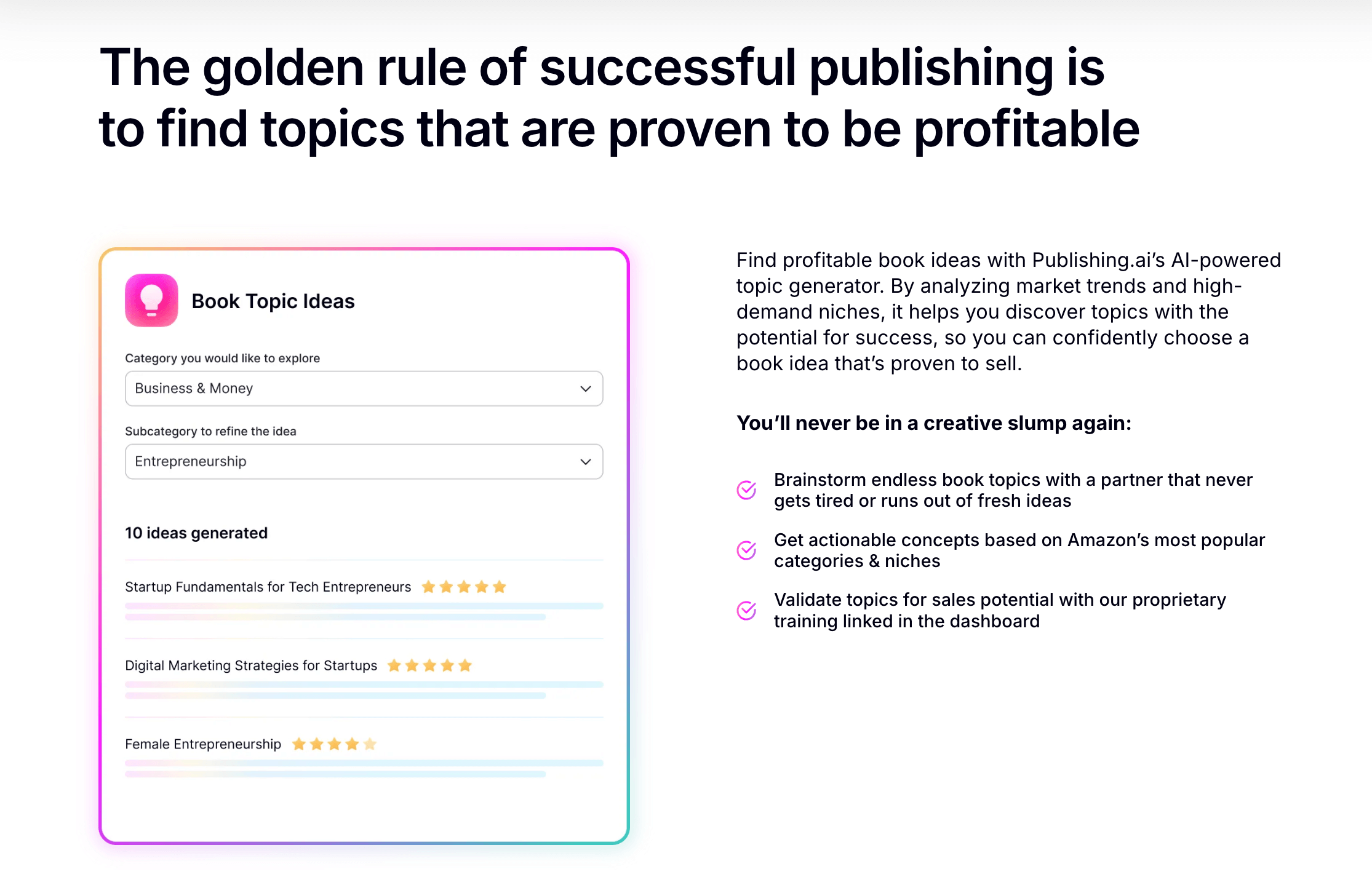 Publishing a book is an art, but it’s also a business. To thrive, you need to understand what readers are searching for. Publishing.ai can find high-demand, low-competition markets and help you maximize your book's potential.