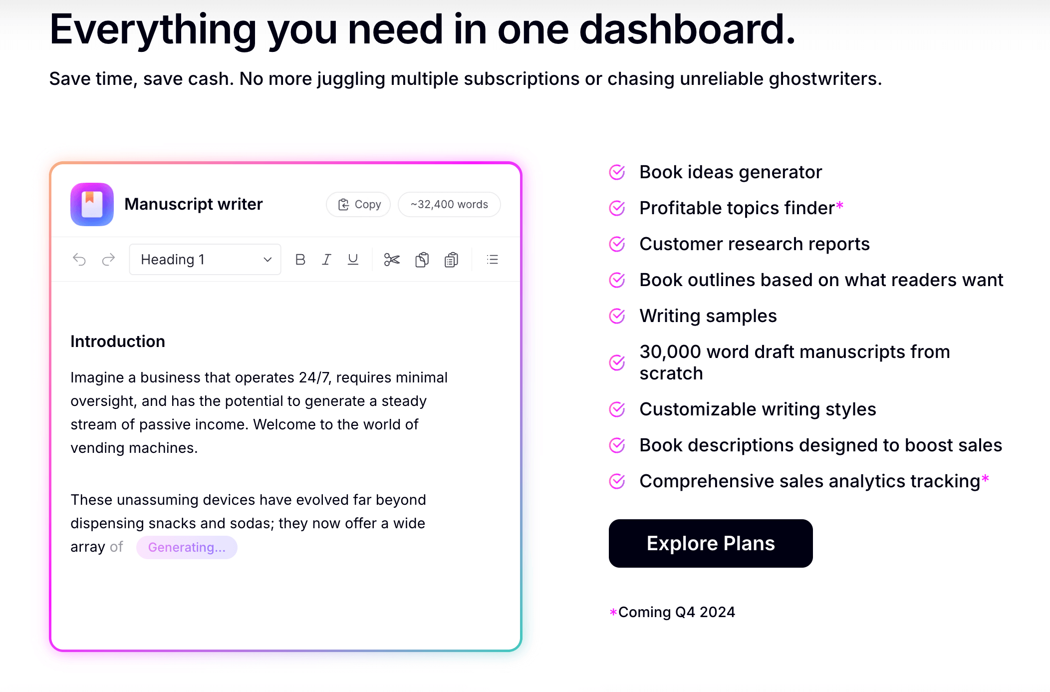 Publishing.ai helps writers create, edit, and format manuscripts for self-publishing on platforms like Amazon. It also offers tools to optimize book descriptions, keywords, and marketing plans, making it easy for even new authors to generate income.