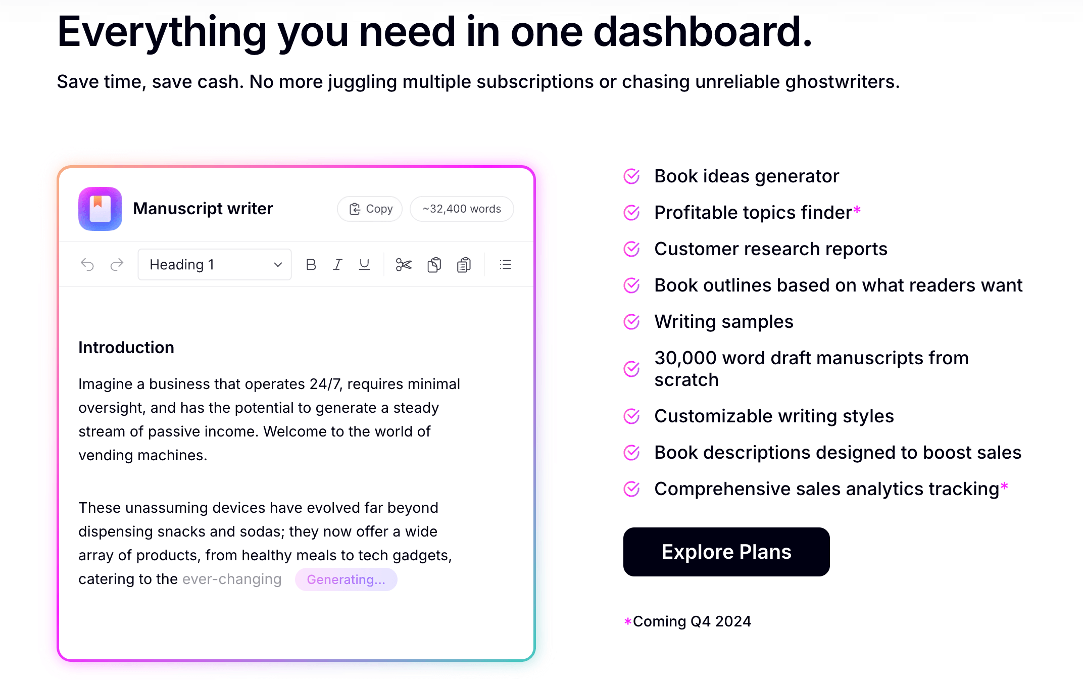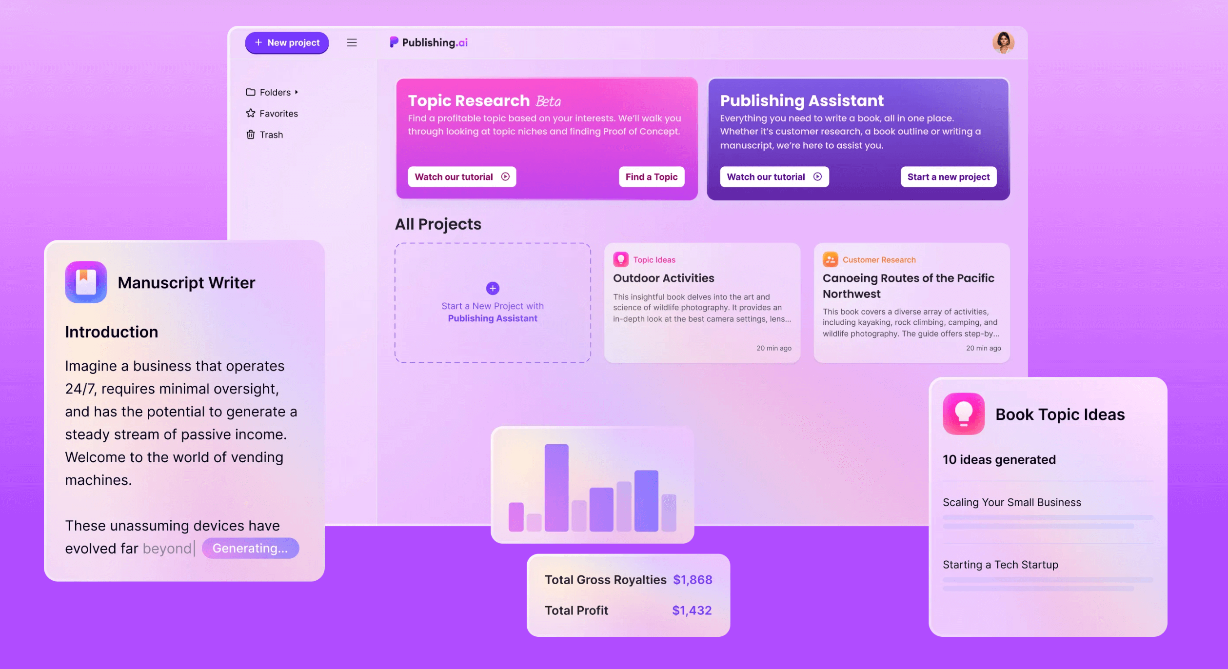 If you're a self-publisher searching for an all in one platform to elevate your nonfiction writing and publishing process, Publishing.ai deserves your attention. Designed with efficiency and quality in mind, it is the best writing app packed with AI-powered features that save time and effort while ensuring professional-quality output. Imagine having a virtual assistant that guides you through every step of the self-publishing journey, from brainstorming ideas to analyzing sales data, that's the power of Publishing.ai.