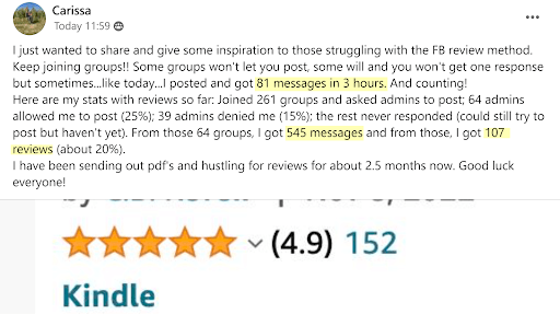 Our process has led thousands of people to self-publishing successes. From generating recurring income to achieving high-ranking sales, we love seeing our students crush their goals. Carissa got an incredible 107 reviews for her book through Facebook outreach alone. Her persistence and hard work got great results, and she was kind enough to share the insights she gained from the experience.