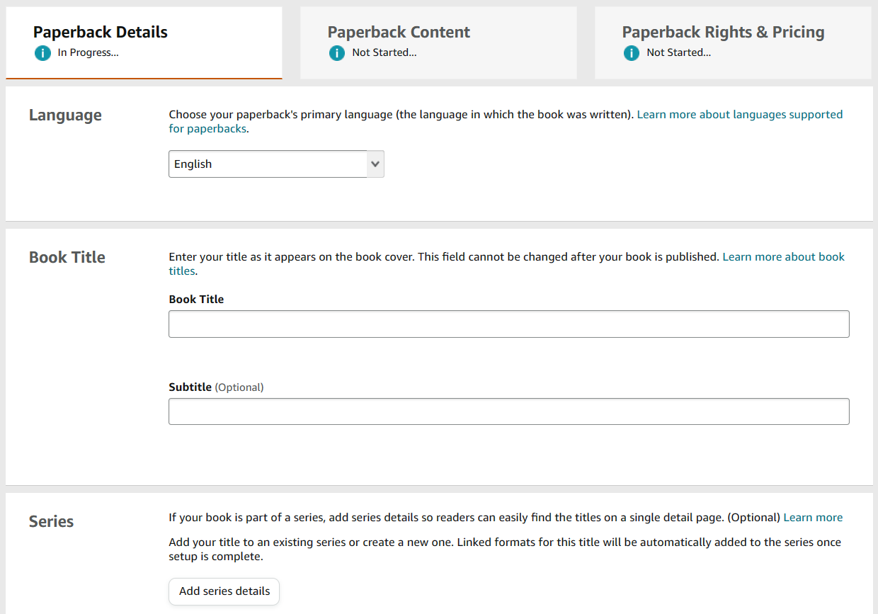 This page will prompt you to start filling out all the information for your book, such as the language the book is written in, book title and subtitle, author name, book description, keywords and categories, and digital rights management information.