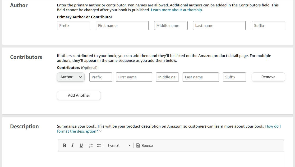 You may choose to enter a pen name for the author box, your first and middle name, or your full legal name. It's entirely up to you! You'll also have the chance to add any contributors that you'd like to recognize. If you worked with a ghostwriter, you own the rights to your book and do not have to recognize them here.