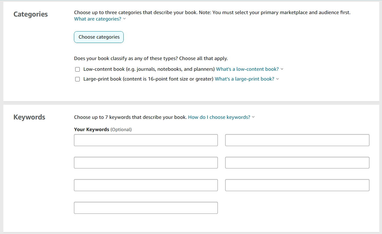 If you forgot to conduct keyword research earlier, you can use AI to do it now. Otherwise, think about the phrases that people would type into Amazon to search for your book and enter up to 7 of them below.