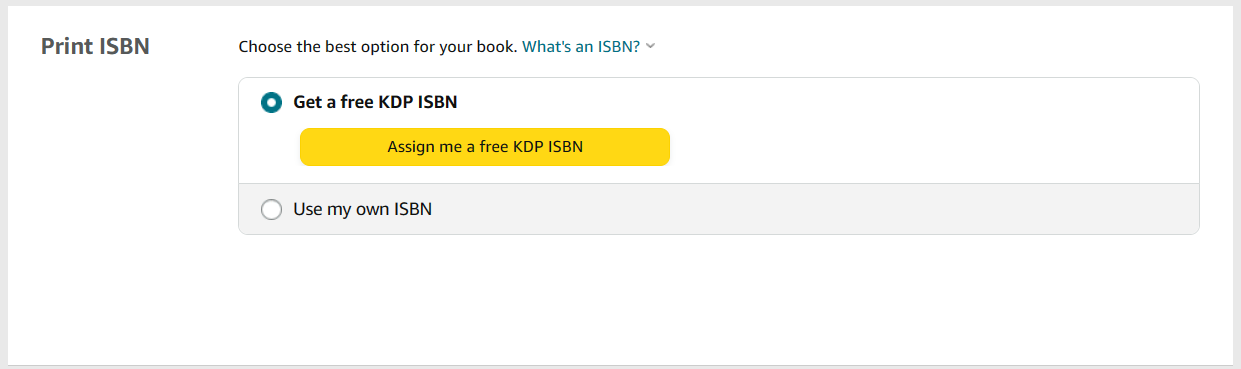 This is where you'll decide whether to get a free KDP ISBN or to use your own. As you start to scale your publishing business, it will make more sense to buy your own ISBN from online marketplaces to give you the freedom to distribute your book to more retailers. But if you're new to the publishing process, getting a free ISBN from Amazon is perfectly fine!