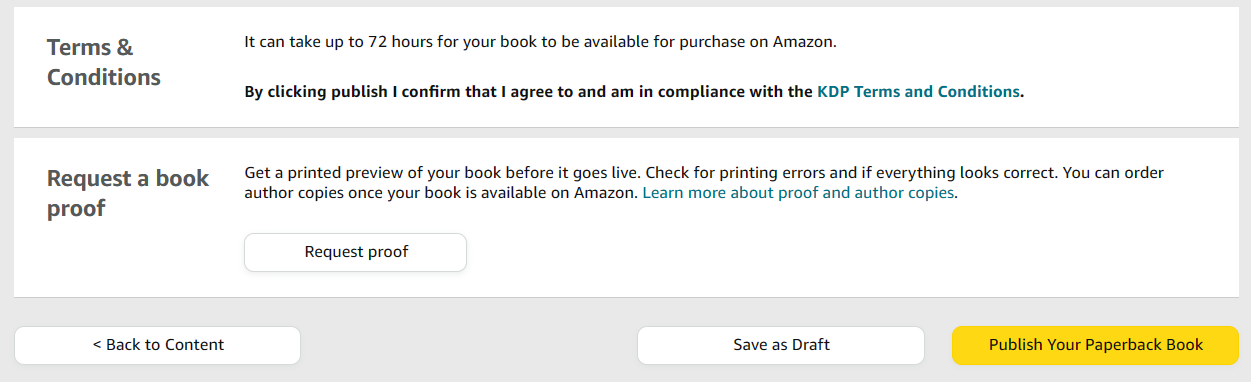 That brings us to the last few steps of getting your book published! You'll need to accept KDP's terms and conditions, and you'll also be asked whether you'd like to request a proof copy of your book.