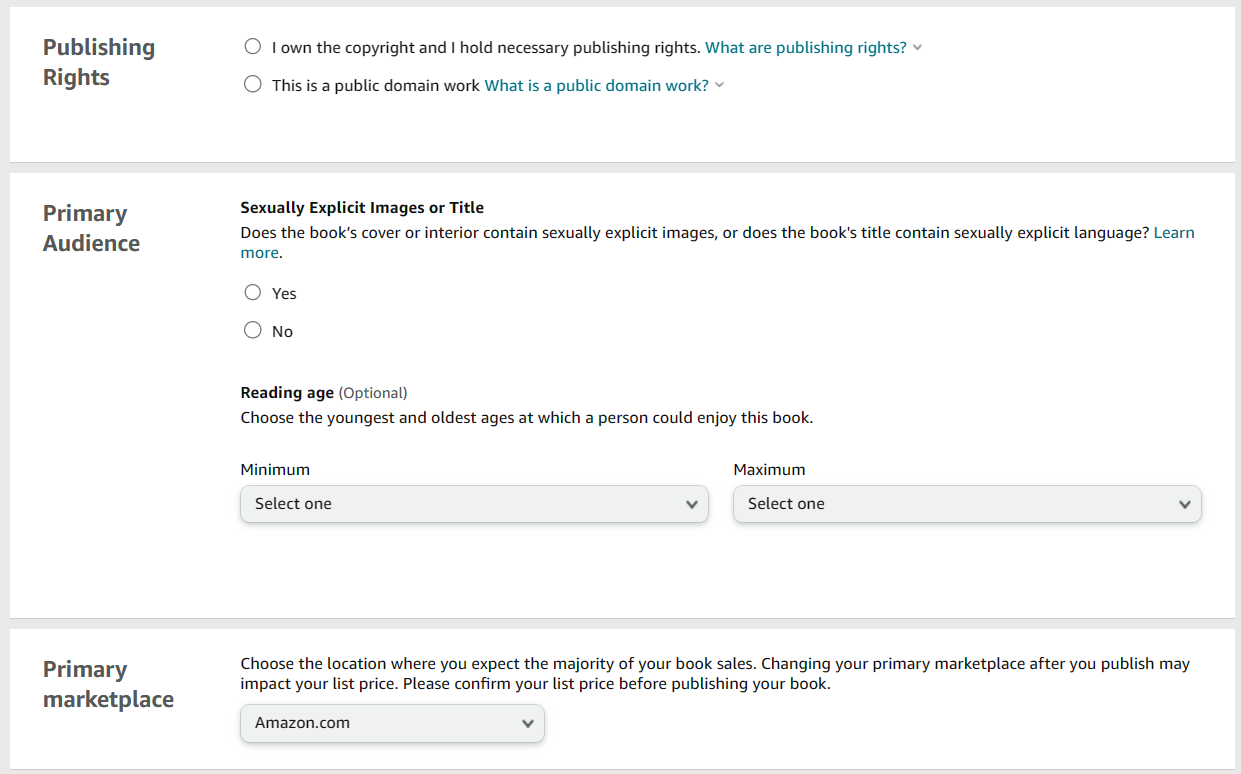 As long as there wasn’t any copyright infringement and you didn't steal or borrow anyone else's work, you should own the necessary publishing rights to your book. Then, you'll be prompted to disclose whether your book's cover or interior contains any explicit adult content. Lying to Amazon always runs the risk of an account deactivation, so be honest!