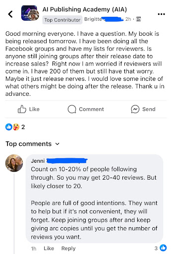 We’re not saying this to scare you; it’s just how it is. People are extremely busy these days and having to follow up more than once comes with the territory of self-publishing. Below, we’ll talk about the actual numbers and different strategies to boost your reviews based on this question that Brigitte asked in our exclusive AIA Facebook group.